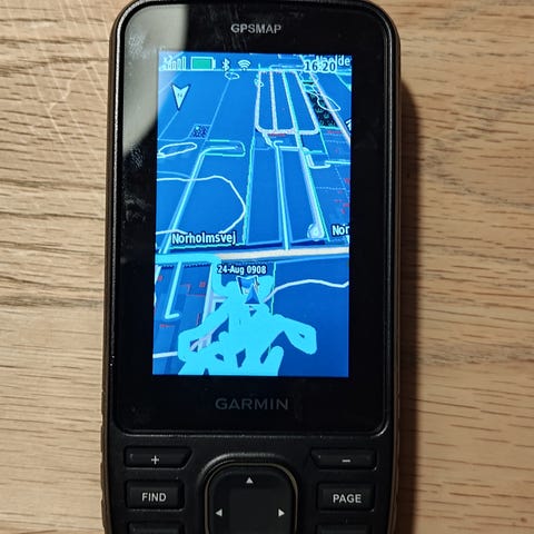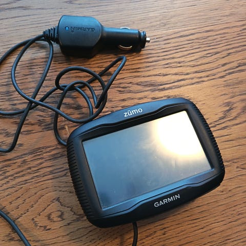 Garmin ZUMO 396 GPS navigationsenhed med farveskærm, der viser kort og rutevejledning. Enheden har funktioner som kortvisning, søgning og indstillinger til tilpasning af navigation. Velegnet til brug på motorcykel til at finde destinationer og følge ruter.