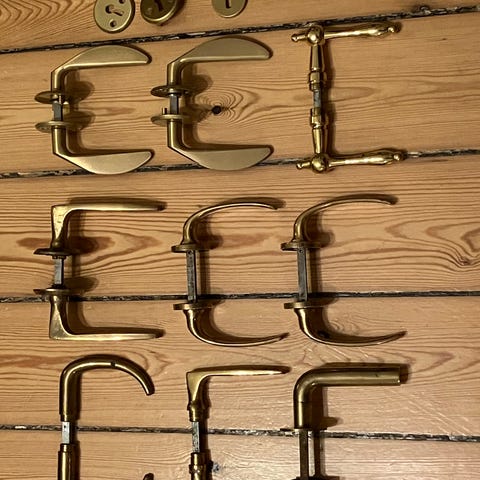 6 stk hvide dørgreb med messing-fod beregnet til skabsdør eller kommode