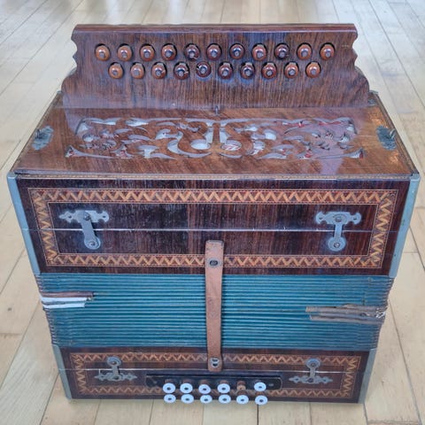 Flot og velholdt tysk diatonisk koncertina, produceret i German Democratic Republic ca. 1960- 1980.