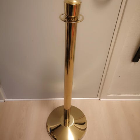 Afspærringsstolper med tilhørende rød reb. Stolperne er sorte med kugleformede toppe og bruges til at afspærre områder eller styre adgang. Rebet er rødt og lavet af stof eller lignende materiale.