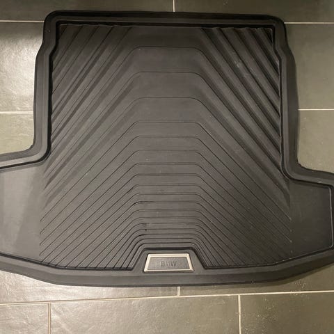 BMW bagagerumsmåtte i sort gummi designet til at beskytte bagagerummet mod snavs og slid. Måtten har et mønster, der hjælper med at forhindre genstande i at glide under transport.
