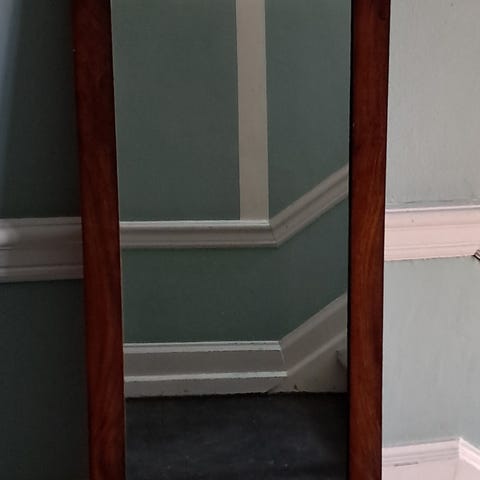 Gammelt mahogni figurspejl med fasetslebet spejlglas, mål: 127 x 52,5 cm