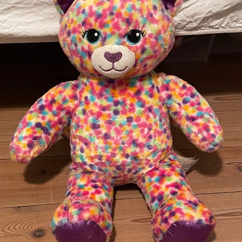 Build-A-Bear bamse i hvid pels med blå trøje med orange og hvide striber samt nummer 00. Bamsen er designet til børn og kan bruges som legetøj eller samlerobjekt.