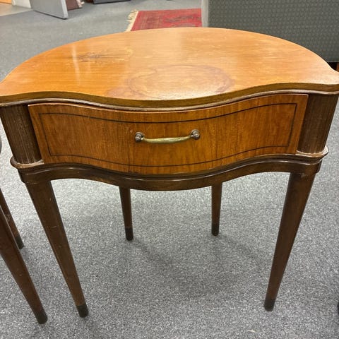 Møblet er en oval bord med en skuffe. Det er lavet af træ med en naturlig finish. Stængerne er slanke og elegant formet.