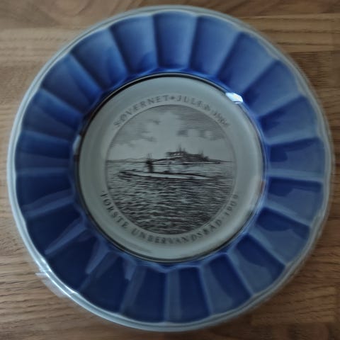 Søværnets juleplatter år 1974 til 1981 platterne har en rund form med en blå bølget kant og et detaljeret motiv i midten. Porcelæn.
