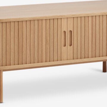 Jysk tv bord i træ med rundede kanter og lamel-front. Skænken har ben og to skydelåger med integrerede håndtag, der giver et stilrent og funktionelt design. Egnet til opbevaring i stue eller andre rum.