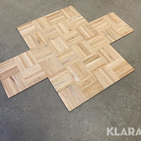 Palle med ubehandlet træ-gulv i massiv egetræ, mosaik-mønster (Blindboden Mosaik). Produktet består af flere kasser med små mosaikfelter som er sammensatte af massivt træ.