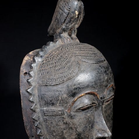 Baoulé-maske fra Côte d’Ivoire i træ, dateret 1930–1940, i fremragende stand med minimale slidspor, høj 30 cm, bred 14 cm, vægt 770 g, provenance Fransk samling (Mr Jean Louis VIOT) og certifikat fra Galerie des Dominicains (Bruxelles). Klik på den blå "gå til varen" knap, for at købe eller byde på denne vare. Den samlede pris vil blive vist inden du afgiver dit bud.