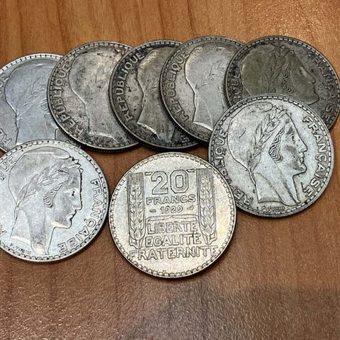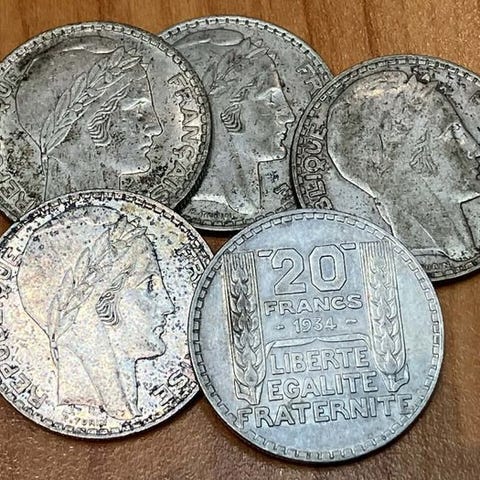 Lot på fem 10-franc Turijn-mønter, 136 g rent sølv, Frankrig, ugraderet. Klik på den blå "gå til varen" knap, for at købe eller byde på denne vare. Den samlede pris vil blive vist inden du afgiver dit bud.