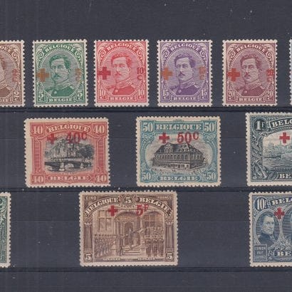 Oprindelsesland Belgien, Uitgiften Caritas - komplette serier med udvalgte centreringer + certifikater, postfriske frimærker fra 1910 til 1911, katalogiseret OBP/COB 84/107, med certifikat. Klik på den blå "gå til varen" knap, for at købe eller byde på denne vare. Den samlede pris vil blive vist inden du afgiver dit bud.