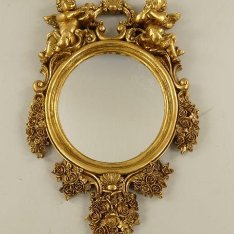 Spejlet har en oval form, med en gylden indre ramme og originalt eller gammelt glas (der ses mærker og tegn på produktionen, som er