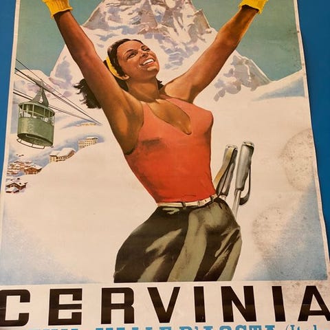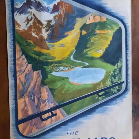 Storformat dekorativ plakat, meget læselig og detaljeret, eftertragtet til schweizisk alpint- og sølandskabsikonografi.