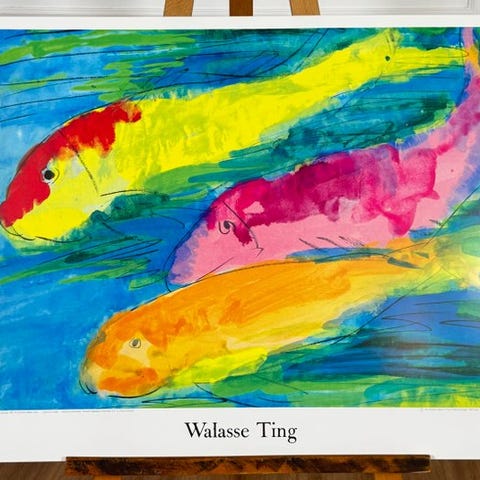 Plakat udgivet af Yvon Briére Éditeur, Paris, dedikeret til værket "Two Parrots" af Walasse Ting. Billedet viser to papegøjer med intense farver — rød, grøn og gul — på en lys blå baggrund, der fremhæver deres livskraft. De hurtige og gennemsigtige penselstrøg fremkalder kunstnerens spontanitet, hvor den orientalske følsomhed forenes med den moderne ekspressionismes frie gestik.