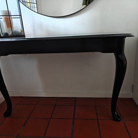 Form: En halvcirkelformet eller demilune bordplade med en lige bagkant, der gør det muligt at placere den op ad en væg.