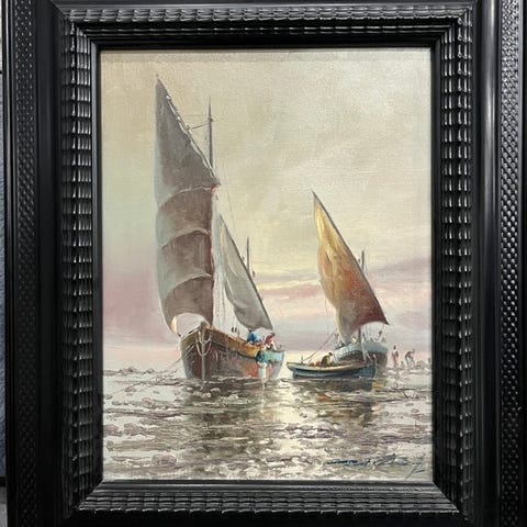 Originalt oljemaleri Pescadores af Juan de Araez (1924–2014), samtidskunstner fra Spanien, skildrer et marlandskab, dateret 1980–1990, håndsigneret, 32 × 27 cm, indrammet. Klik på den blå "gå til varen" knap, for at købe eller byde på denne vare. Den samlede pris vil blive vist inden du afgiver dit bud.