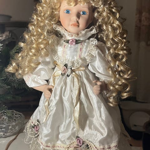 16 cm bade-dukke, lyseblondt hår, hvilket er sjældent, sædvanligvis sort, blå øjne og en tydeligt rød mund, ingen skader