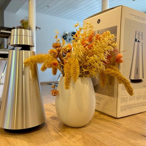 De Beosound A1 2nd Gen er en eksklusiv, støv- og vandafvisende, ultrabærbar Bluetooth-højttaler med indbyggede mikrofoner, til krystalklart lyd til webmøder og opkald. Den har god lyd, flot design og en imponerende fyldig og klar lyd for en Bluetooth-højttaler, der er så kompakt, at den nemt kan passe i hånden.