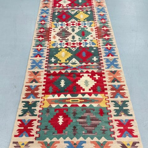 Præsenteres en smuk Sumakh Kelim fra Afghanistan, der imponerer med sin unikke oprindelse og traditionelle håndværk.