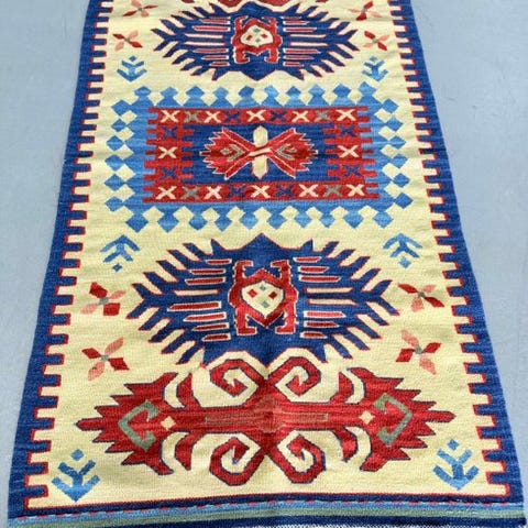 Håndvævet kaukasiske Kilim fra Azerbaijan, model Kilim Caucasico, beg. 20. århundrede, måler 290 × 73 cm, vægt 3 kg. Klik på den blå "gå til varen" knap, for at købe eller byde på denne vare. Den samlede pris vil blive vist inden du afgiver dit bud.