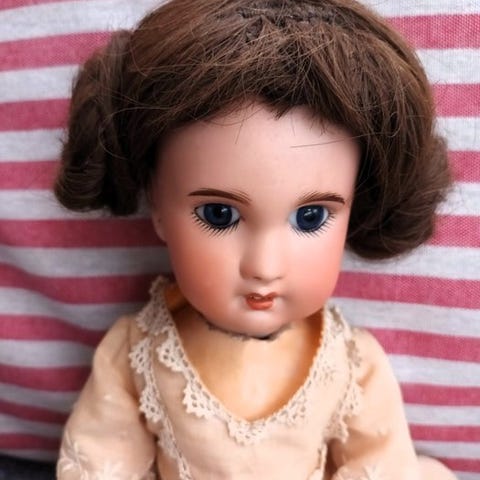 Elegant gammel fransk dukke SFBJ (Société Française de Fabrication de Bébés et Jouets), model 301, dateret fra begyndelsen af det tyvende århundrede (ca. 1900–1915).