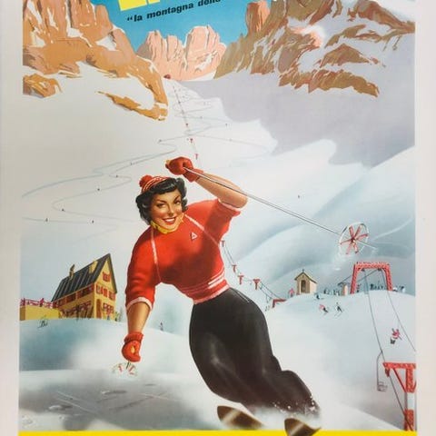 Scenen, frisk og dynamisk, afbilder en smilende skiløber i forgrunden, med Cervino/Matterhorn i baggrunden, gondolbanen og snedækkede pister: en perfekt komposition typisk for det alpine turistboom i efterkrigstiden.