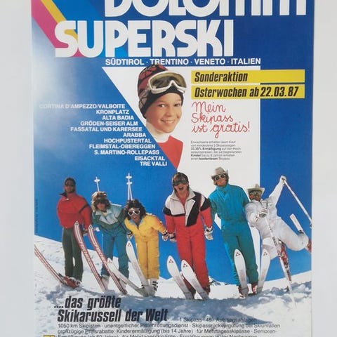 Smukt turistplakat dedikeret til Cervinia – Breuil, Aosta-dalen, officiel genudgivelse lavet i midten af 1990’erne af det berømte plakatmotiv udgivet af Musati i 1953, i dag en absolut ikon inden for italiensk sportsillustration.