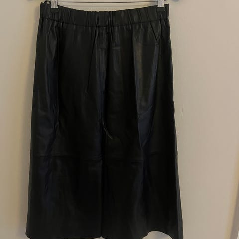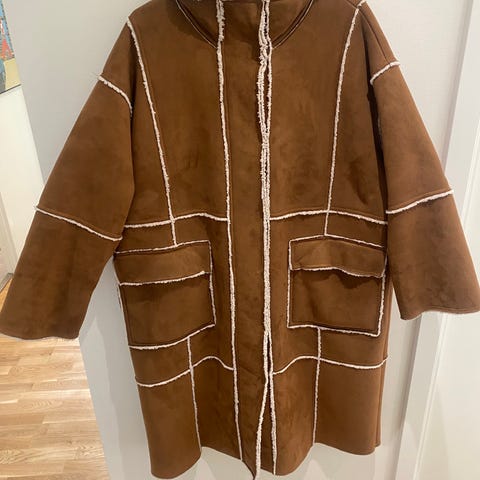 Stand Studio frakke, model 'Gaia coat' – en frakke af vegansk laklæder med sort foring af økologisk pels. Ny, uden papirmærkat. EU-størrelse 36 oversize, passer til EU 38. Se mål: Længde 90 cm, Ærme 60 cm, Bryst op til 100 cm, Talje op til 106 cm, Skuldre 40 cm.