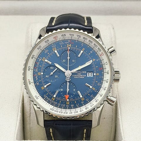 Blå urskive med tre små urskiver og slide rule bezel. Medfølger en ekstra original Breitling-rem.