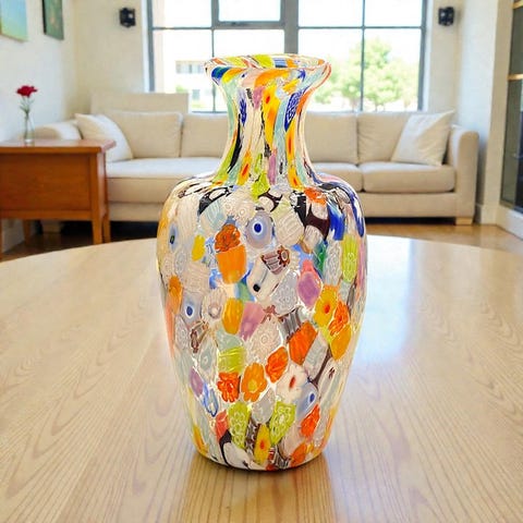 Vasen 'Bizantino' i Murano-glas, med millefiori-murrine og sølvblad 925, er et håndlavet kunstværk, der er mundblæst af mesterblæseren Filippo Maso i den berømte Murano-ovn. Tilstedeværelsen af et certifikat for ægthed Murano-glas garanterer ikke kun oprindelsen og kvaliteten af værket, men tilføjer også en distinktiv værdi til dette elegante kunststykke.