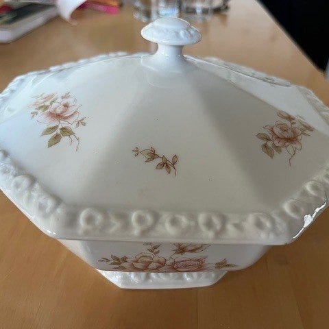 Alle delene er stadig meget flotte og ser ud til at være brugt ganske lidt. Bortset fra én suppeskål med en lille randchip er delene uden skader.
