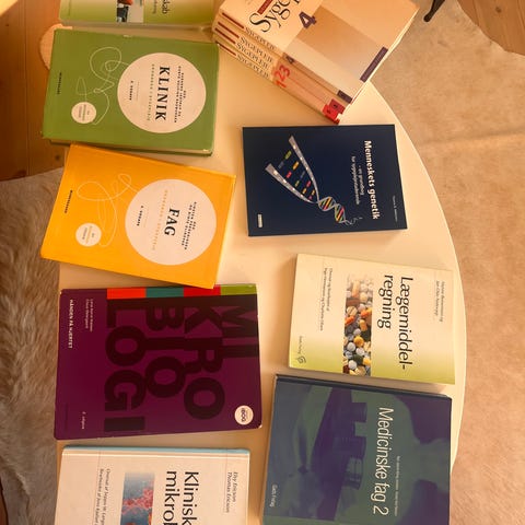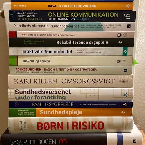 Samling af diverse bøger til undervisningsbrug, herunder fag som sygepleje, patologi, klinik og medicin. Bøgerne varierer i farve og omhandler forskellige emner inden for sundheds- og sygeplejeområdet.