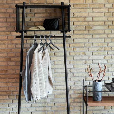 Masser af gulvplads/Bøjlestang til jakker og skjorter/ åben kasse til tasker.Huer og andre dagligdags ting. Samles uden søm og skruer. Perfekt til den lille lejlighed.