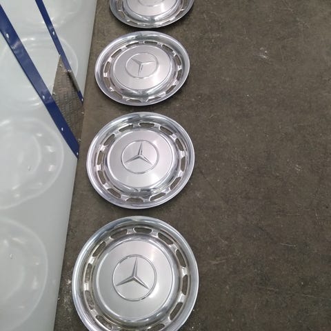 Hjulkapsler til Mercedes W123 i sølvmetal. 14 tommer med klips.