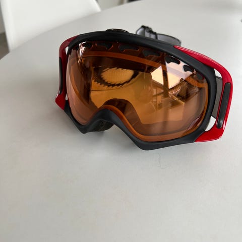 Oakley skibriller med orange linse, hvid og sort ramme. Designet til at beskytte øjnene mod sne og sol ved skiløb eller snowboarding.