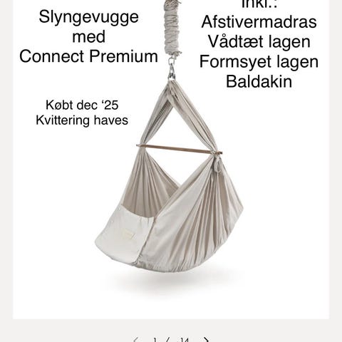 Alt købt fra ny i dec 25 og brugt maks. 20 gange, da vores barn hellere vil ligge i Moonboon vuggen, som vi derfor bytter slyngevuggen ud med. Alt virker ubeklageligt.