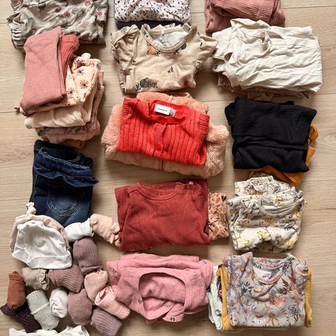pige tøj i størrelse 50. Sættet indeholder forskellige beklædningsgenstande til børn, egnet til piger i den angivne størrelse. Mindst 25 sparkedragter, flere kjoler, bluser og andet.