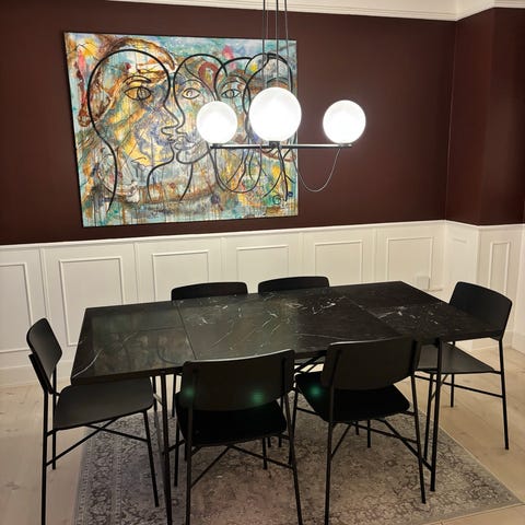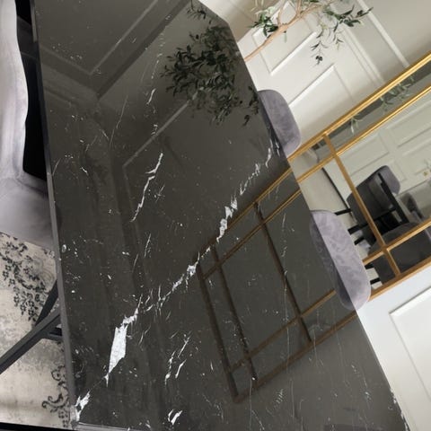 Black marble dining table with space for 6 people.