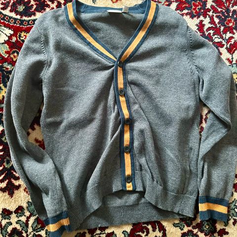 En strikket sweater med lange ærmer og rund halsudskæring. Sweateren har et mønster i forskellige nuancer af blå og grå.