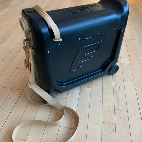 Stokke JetKids børnekuffert i lyserød. Kufferten er designet til børn og kan bruges som både opbevaringskuffert og som en benstøtte og soveplads under flyrejser. Den har hjul og en rem til nem transport. Børnene elsker den.