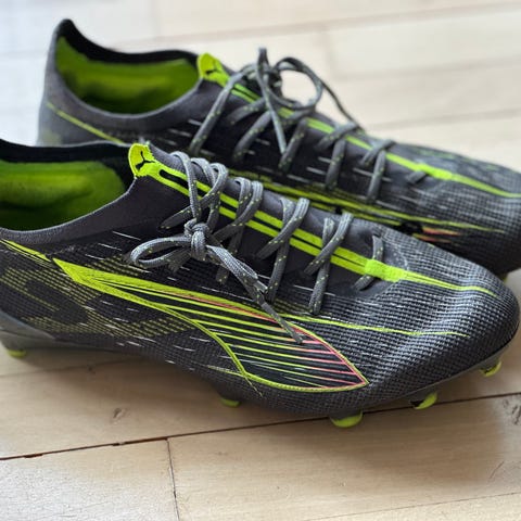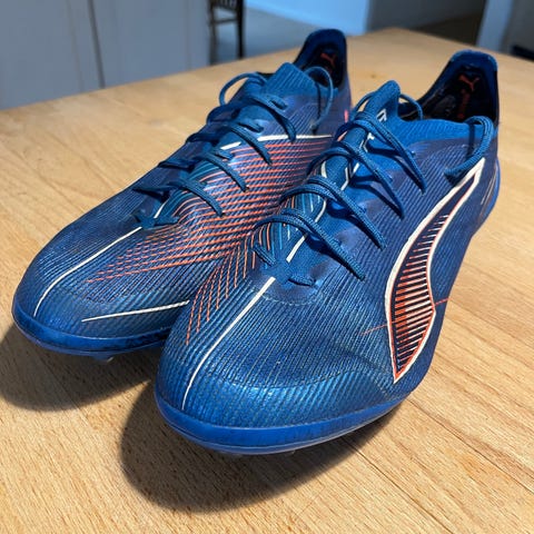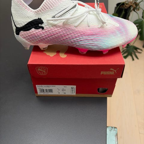 Puma Ultra 6 Ultimate MG fodboldstøvler i hvid farve, størrelse 42. Støvlerne er designet til voksne og har multifunktionelle knopper til brug på forskellige underlag. De er rigtig gode på kunstgræs.