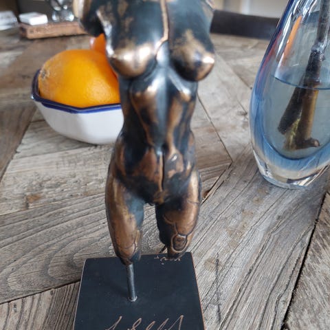 Skamstøtte 6 cm signeret og nummereret. Jens Galshiøt samt Pins 4,5×4,5 cm.