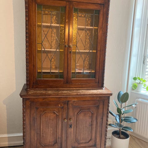 Mega fint Art Deco vitrineskab fra 30’erne. Skabet er malet i en fin varm latte farve, har trukket glas i lågen, smukt ornamenteret messinggreb og 4 faste hylder.