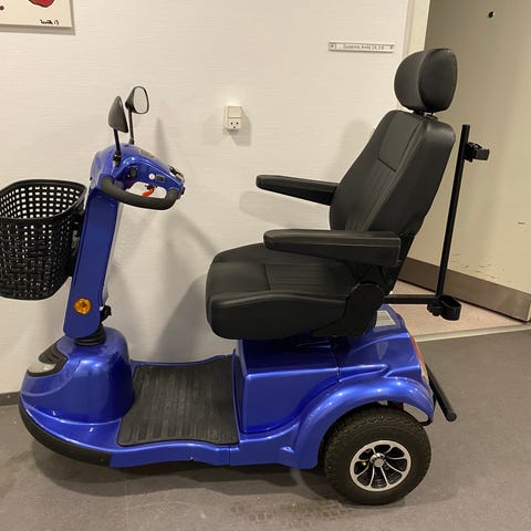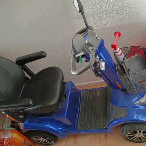 El-scooter, rød med kaptajnsæde og kurv foran. Her en skade på frontskjold (se foto). Kører rigtigt fint, og med nyere batteri. Kom med et bud.