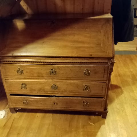 Skrivebord i træ med en skuffe og et skab. Bordet har en rektangulær bordplade og fire ben. Farven på træet er brun. Skrivebordet er egnet til opbevaring og som arbejdsplads.