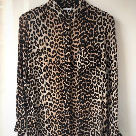 Meget smuk Ganni skjorte , brugt 1 gang. Der står xs 7 den men passer perfekt en str 38. Farven er lys grå med mønster i grønne og pudder nuancer.