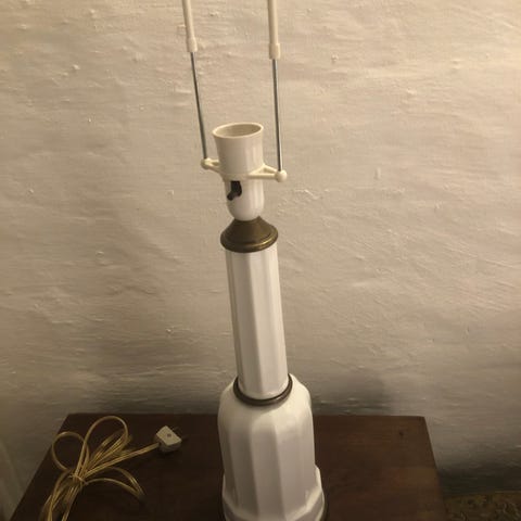 Heiberglampe i hvid porcelæn med messingfod m.m. og bakelit fatning.