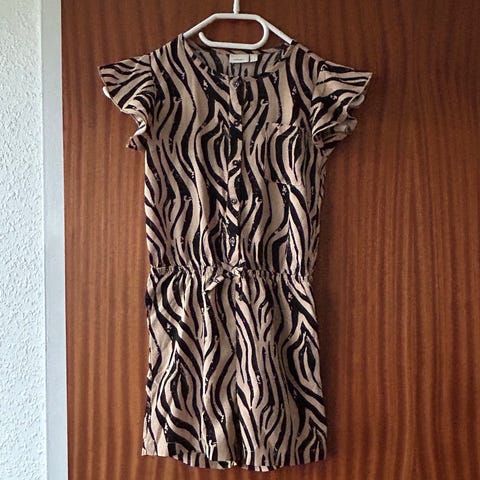 En blå buksedragt med hvidt blomstermønster. Dragten har et ærmeløst design med en asymmetrisk halsudskæring og elastik i taljen.
