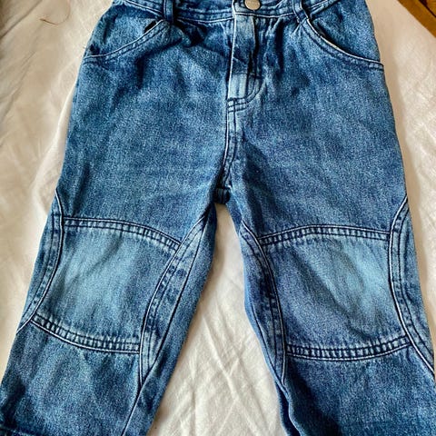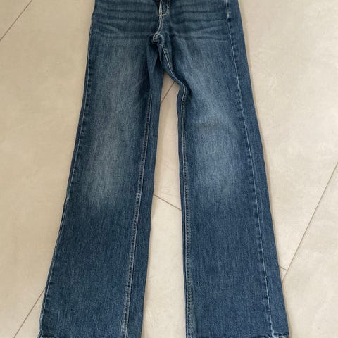 Et par grå jeans med lige ben og lynlås foran. Bukserne har to lommer på forsiden og to baglommer.