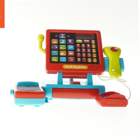 Denne legetøjslegetøjskasse, stiliseret som et McDonald's kasseapparat, er lavet af plast og har dimensionerne 11x35x18 cm. Den er primært rød og gul, med synlige McDonald's logoer og grafik på forsiden. Kasseapparatet har en række knapper og funktioner, der efterligner et rigtigt kasseapparat, herunder en skærm og en scanner med ledning.