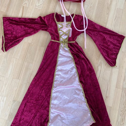 Sættet består af en rød kjole med hvide pufærmer og snørelukning foran. Der medfølger også en rød hat og en hvid forklæde med farverige detaljer.